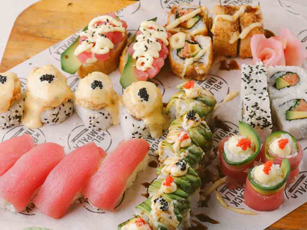 4x California Rolls, 4x Nigiri, 8x Catepillar, 4x Prawn Avalanche, 4x Prawn Crunchy Roll, 3x Salmon Roses & 2x Bean Curd